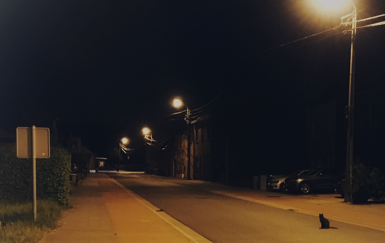 Ik verlaat het voetpad en wijk uit naar het midden van de straat, net als de kat. Eventjes maar. Omdat het kan. De verkeerslichten verderop springen op rood, groen, oranje. Er komt niets voorbij.
