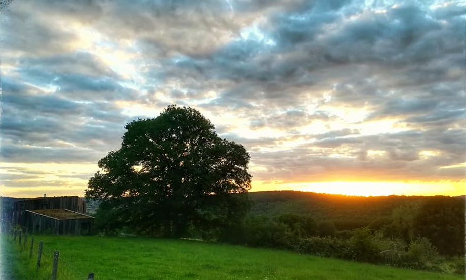 Beneden op de uitgestrekte weide grazen de koeien en ’s avonds verdwijnt de vuurrode zon achter de boomtoppen van de omliggende bossen.