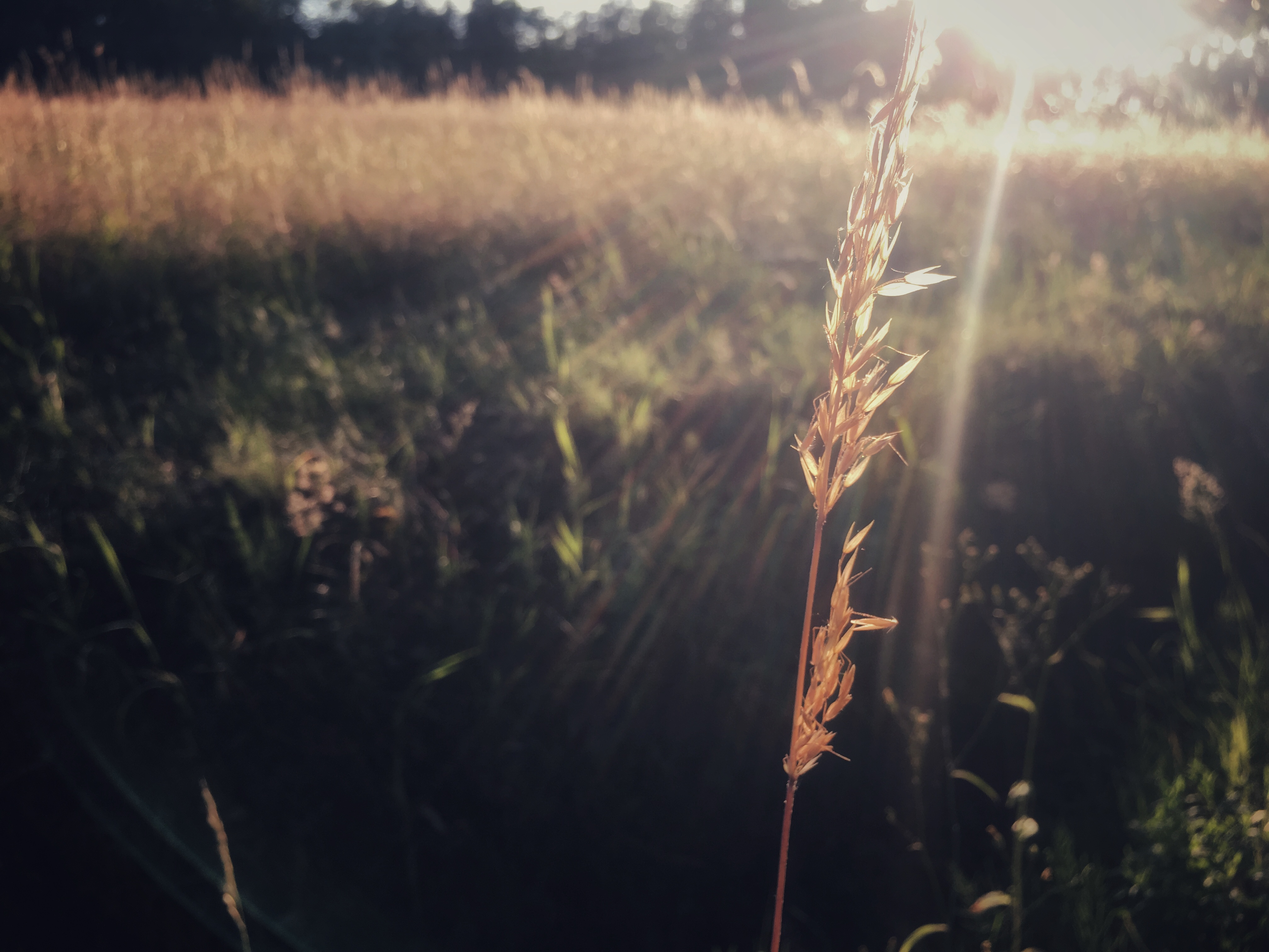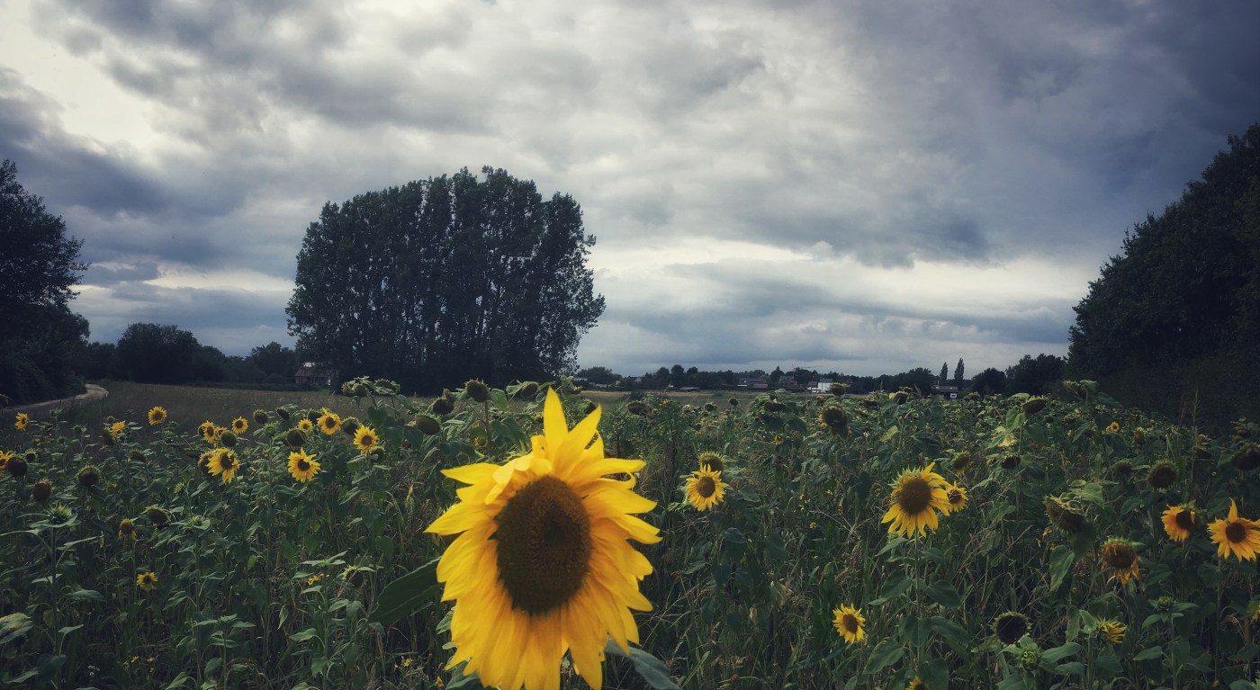 Dit zijn de plaatsen waar ik het avondlicht zo mooi kon vangen, neergestreken op bloemen en halmen. Wie heeft mij dat afgepakt? Of is dit hoe het nu eenmaal gaat met de seizoen, ze geven en ze nemen om dan opnieuw te kunnen geven? De zonnebloemen verderop troosten me. Verschillende exemplaren hangen er uitgebloeid bij, maar sommigen geven nog het beste van zichzelf, fel geel tegen een grijze achtergrond. Er hangt opnieuw regen in de lucht.