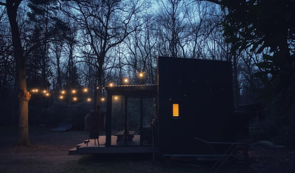 Later, wanneer de sauna weer afkoelt en het kampvuur uitdooft, sta ik nog even alleen in het bos. Het is bijna middernacht en ik knip de lichtslinger rond het huisje uit. Er ritselt van alles tussen het struikgewas. Tussen de boomkruinen fonkelen sterren. Dit stukje bos op een boogscheut van Brasschaat city is niet bepaald het uiteinde van de wereld, maar even voelt het zo.