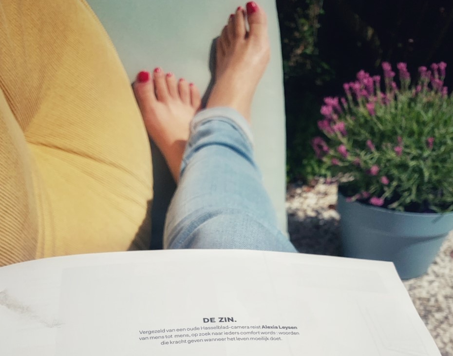 Ik deel een snapshot van de quote op mijn Levenskunst Instagram, inclusief glimp van benen op de bank. ’s Avonds is er een bericht van Alexia Leysen. Ik ken haar niet en zij mij niet. Tot nu dan. Ze heeft mijn beeld gespot. ‘Wat een fijne foto van DE ZIN! Mag ik die gebruiken?’ Dat mag ze. Het is tenslotte haar rubriek die ik aan het lezen was. ‘Ik wil elke week wel een foto van DE ZIN op jouw chillende benen in de zon :-)’ antwoordt ze. Ik moet lachen. Het ging mij om de quote, maar de chillende benen spreken blijkbaar ook tot de verbeelding. Het zijn de benen van een vrouw die steeds beter leert lanterfanten omdat ze voelt hoe belangrijk dat is, jezelf een poosje kwijt maken, een koffie nemen en de tijd. De wereld even aan je voeten leggen, en laten liggen. **