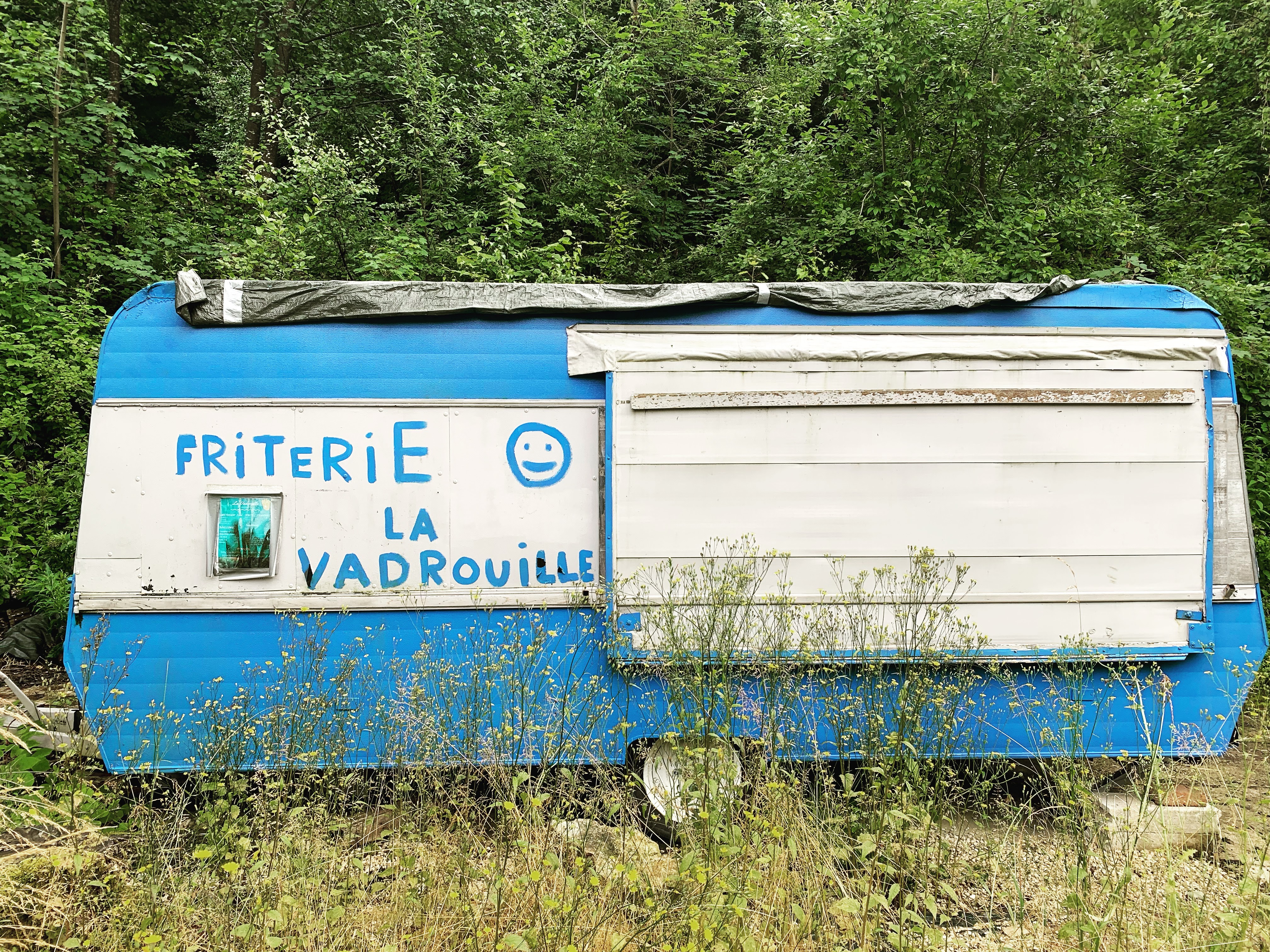 Terwijl de Belgische dorpjes zich levendig tonen met terrasjes, B&B’s en gîtes waar de zomergasten stilaan vertoeven, verdwijnen de sporen van toerisme zodra we de landsgrens over zijn. Bij gebrek aan rivierpad bereiken we les Hautes-Rivières na een gevaarlijk stuk hoofdweg waar de Fransen rijden als zotten. De lucht is dreigend, de huisjes grauw. Langs de rivier zien we industrie, maar de tijden dat de dorpsbewoners hier talrijk werkten in de fabriekshallen, zijn voorbij. Leegstand en hier en daar regelrecht verval verraden het lot van dit dorp anno 2022. Op een pleintje spelen een paar kinderen. Twee vrouwen roken zij aan zij in het gat van hun voordeur.