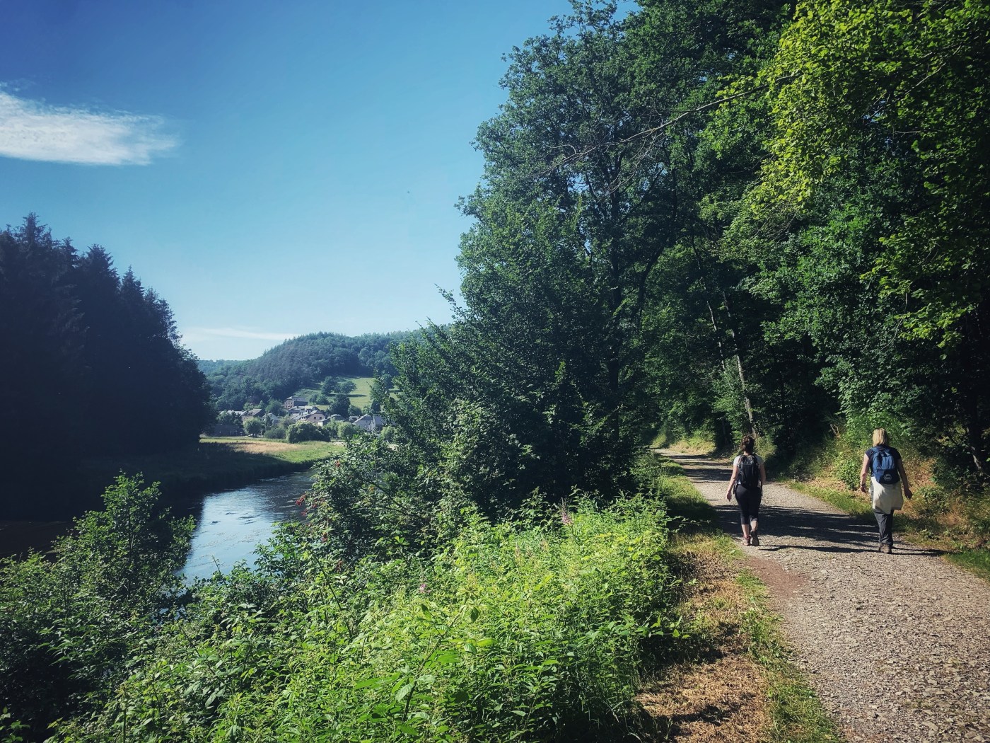 We houden het op wijs. Behoedzaam keren we terug, afremmend op onze knieën en voeten. Een local bevestigt ons dat er een pad is langs de rivier tot het volgende dorp. Het blijkt één van de mooiste stukken van onze hele wandeltocht te zijn, tussen Mouzaive en Vresse-sur-Semois. Daar logeren we bij Marc en Agnès die heerlijk voor ons koken. Aan ons buitentafeltje eten we rilette de thon en poulet à l’ancienne, met de Semois als steeds aanwezige metgezel in de achtertuin.