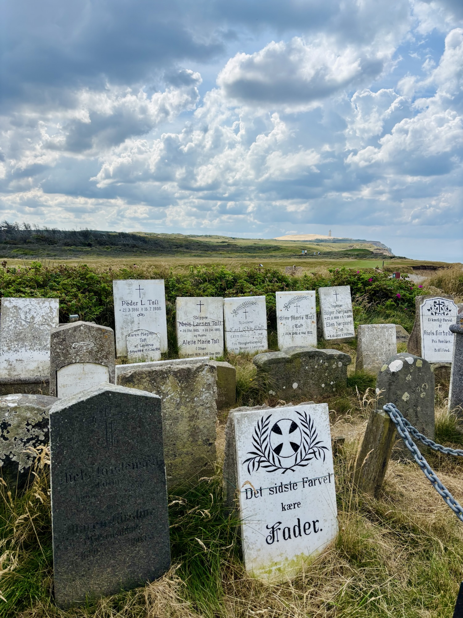 Rubjerg Knude. Het zou de naam van een Deense man kunnen zijn, een afstammeling van één of ander Vikinggeslacht. Niets van dat. Rubjerg Knude is een vuurtoren langs de ruige westkust van Noord-Jutland. Van ver zie je het witte baken boven het woeste duinenlandschap uitsteken. Op deze zomerdag met wollige wolken in een blauwe lucht lijkt het net een schilderij. Onze voeten zinken weg in het duinenpad dat ons klimmend en dalend naar Rubjerg Knude brengt. Hetzelfde beweeglijke duinzand slokt de toren langzaam op, met behulp van de eroderende kustlijn. Van de rand van de kliffen blijf je hier beter weg. Niet ver van de vuurtoren heeft de dorpskerk het al begeven. Er rest alleen nog een deel van het oude kerkhof. Det sidste farwel kaere fader / Het laatste afscheid lieve vader, leest een liefdevolle boodschap op één van de oude grafstenen. Onvermijdelijk zullen ook deze graven verdwijnen door de kracht van de natuur.